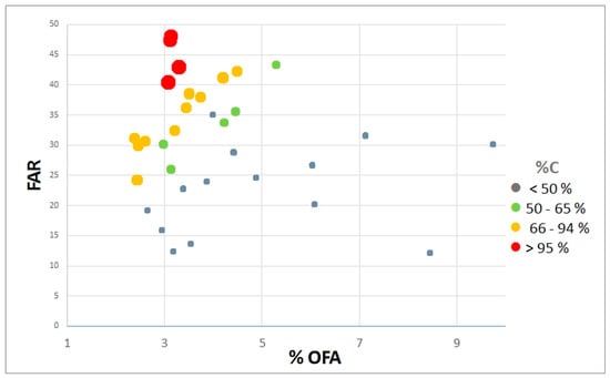 Distribution of seismic retrofitting costs coverage (% C) according to the values of FAR (m3/m2) and % OFA (%).