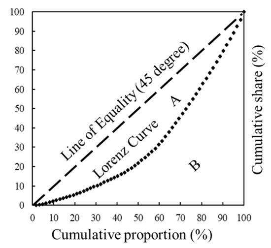 Figure 1 showed an example of a Lorenz curve. The Gini coefficient is the ratio of the area A to the area (A+B) [18,19], as calculated in Equation (2). The Gini coefficient could be approximated from the curve using the trapezoidal rule in which the area B in Figure 1 was calculated by the sum of all trapezoids.