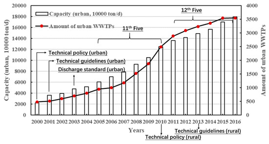 One of the reasons that urban wastewater treatment is developing much faster than rural wastewater treatment was their different legislation processes in water management. Development and legislation comparison between urban and rural wastewater treatment is shown in Figure 2. Dating back to 2000, urban wastewater treatment in China was also quite undeveloped, with only approximately 20 million ton/d treatment capacity in total. It should be noted that China experienced unexpected fast development in urban WWTP construction in the following 15–20 years. The total amount of urban wastewater treatment in 2016 grew to 179 million ton/d with 3552 WWTPs. The fast growth was closely related to, and guaranteed by, timely legal supports. In the years of 2000, 2001, and 2003, three important legal regulations were issued by the Ministry of Environment including the “Technical Policy for Urban Wastewater Treatment”, “Technical Guidelines for Urban Wastewater Treatment”, and “Discharge Standard of Pollutants for Municipal Wastewater Treatment Plant”. The former two provided basic principles for urban WWTP constructions from the perspective of technical process layout design. Discharge standards provided requirements for WWTP management and defined the discharge limits which were dependent on the type of water body for their effluence to flow into.