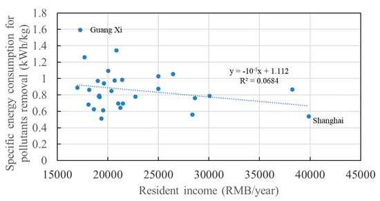 The local discrepancy between provinces was also demonstrated. Based on experiences from urban regions, it was generally demonstrated that the higher the local resident income was, the lower the specific energy consumption for oxygen-consuming pollutants removal was. As shown in Figure 3, the highest average resident income of Shanghai with nearly 40,000 yuan RMB/year achieved quite low specific energy consumption of 0.53 kWh/kg. In contrast, the highest specific energy consumption of 1.59 kWh/kg was located in Guang Xi province, whose resident income was as low as 17,268 yuan RMB/year. Although exceptions do exist, the general tendency suggested the rural cost exceeds the urban cost when same discharge limits were required. It was probably caused by the higher engineering level in more developed areas. Accordingly, in most rural regions which were undeveloped, the financial burden should be carefully considered.