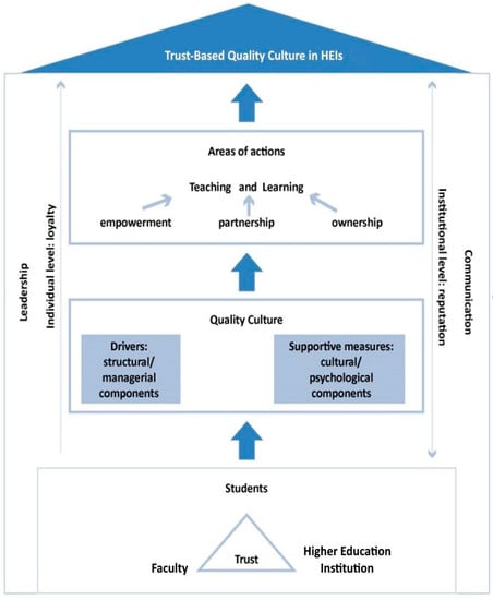 The development of trust serves the purpose of enhancing quality in higher education. As the quality culture in HEIs cannot be taken for granted, it has become the subject of international scientific research contributing to the deeper understanding of this aspect of university functioning [138,139,140]. In research conducted under the patronage of the European University Association (EUA) [141,142,143,144], quality culture is defined as an organizational culture whose main aim is to constantly improve quality. Two key components of the quality culture have been distinguished: The first concerns the cultural and psychological aspect, relating to common values, beliefs, expectations and commitment to quality improvement, while the second is of structural and managerial character and refers to defined processes supporting the quality enhancements and coordinating the work of those involved in quality improvement [141]. This understanding of the quality culture assumes that educational institutions should take care of this aspect of the university’s functioning in such a way that both structural and managerial elements (referring to institutions) as well as cultural and psychological elements (referring to the role of individuals) synergistically support each other and they lead to the constant development of a higher education institution.