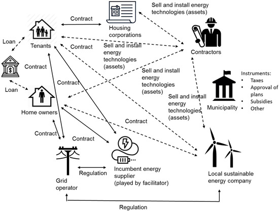 The second challenge, which will be the core focus in this article, concerns the involvement of multiple stakeholders, from house owners to network operators and from producers to different levels of public authorities, with different values, means, and scopes of action. Coordination between these stakeholders is complicated, given the absence of hierarchical relationships and networked relationships amongst stakeholders involved in the transition process [7,35]. Usually, such formal and informal relationships incentivize stakeholders to coordinate and attune actions. They operate on different scales, pursuing different goals and interests, which could lead to conflicting actions and an inefficient transition process, while, preferably, actions are taken that strengthen each other and maximize the individual and collective benefits [11,36,37].