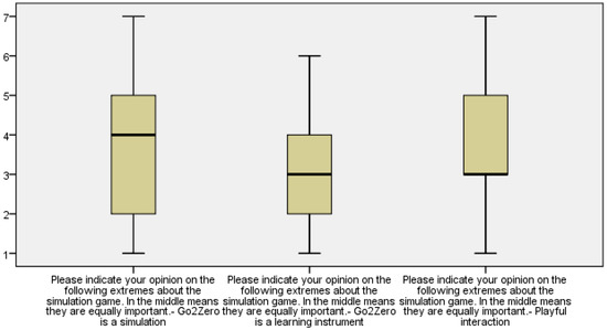 There was no consensus among the participants about how to define GO2Zero (see Figure 4). On the axes of the simulation vs. game, the median was 4, which means in the middle. Maybe this is coherent with our objective to build a simulation game. On the axes of learning instrument vs. policy support tool, the median was 3, which is slightly more to a learning tool, and for the axis playful interaction vs. serious intervention the median was 4. As the boxplot shows, the answers varied for all axes.