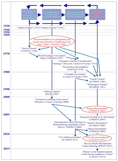 Starting in Vienna, and in response to the request of the World Heritage Committee made at its 29th meeting in “Durban, South Africa, 2005” for the drafting of a new recommendation that would expand on the idea of historic urban landscapes, multiple meetings were held among the advisory bodies (ICOMOS, IUCN, ICCROM) and associated institutions, to the point that it is very difficult to sift through the huge number of minutes, reports, and documents generated during the last decade (Figure 1). There are, fortunately, some recent publications that can guide us through the labyrinth [8].