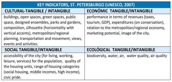 In this regard, after the “Vienna Memorandum” (UNESCO, 2005), the development of indicator systems has become an experimental field in full swing in the framework of the debate on the new heritage strategies of the 21st century [17]. Some of the first proposals put forth by UNESCO itself, in this specific field of historic urban landscapes, were raised in the workshop held in Chandigarh in 2007 [18], or at the convention held in St. Petersburg the same year [19]. At the end of this latter event, a line of work was proposed with four blocks of key indicators in order to analyse the evolution of historic urban landscapes, promoting urban planning policies that prioritize conservation and sustainable development. Refer to the Figure 2.