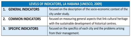 With a scope restricted to historic centres, in April 2009, promoted by the World Heritage Centre and the UNESCO Regional Office in Cuba, a reflection group was created to implement the management policies in Heritage of Humanity cities. The result was the project “Sustainability Indicators in World Heritage Urban Areas”, which proposed a system divided into three levels. Refer to the Figure 3.