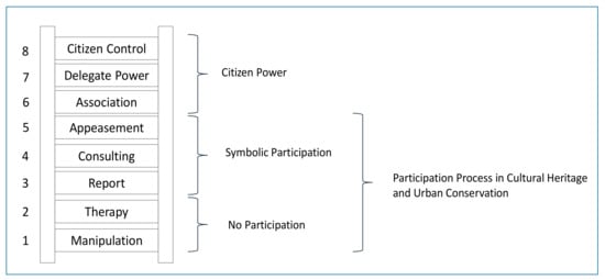 In the diagram in Figure 4, it can be seen how the citizen participation processes in the field of cultural heritage and urban conservation are mainly framed within the first five rungs, corresponding to the levels of non-participation, or in the best cases, symbolic participation. At the first level, the participation processes are used to “educate” citizens, while at the second level, participants can express their opinions and make judgments, but without any certainty that their proposals will be taken into account in the final decision making.