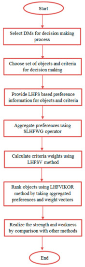 Before getting into further discussion of the proposed concepts, it is essential that we present a flowchart representation of the proposed framework. This enhances the understanding of the framework and gives a clear idea of the decision-making process. Figure 1 depicts the flowchart of the proposed decision-making framework under an LHFS context.