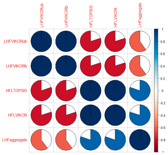 From Table 8, we clearly observe that the proposed method produced a unique ranking order with a broad and sensible rank value set that is much more sensible and reasonable as it considered both the linguistic terms and its corresponding membership degrees to properly reflect the hesitancy in the process. In contrary, the HFLTS-based methods (discussed in Table 8) failed to properly reflect the hesitation of the DM. Further, the consistency of the proposal was realized by using the Spearman correlation method [56]. From Figure 2, it can be clearly observed that the proposed LHFS-based VIKOR method produced a correlation value of with respect to the LHFS-based VIKOR (unbiased), HFLTS-based TOPSIS, HFLTS-based VIKOR, and LHFS-based aggregation methods. This showed that the proposed method was not relatively consistent (negative relation) with other methods and it produced a unique ranking order. Though, readers question this aspect, the reason for such values can be easily realized from the loss of information that was incurred during the process of evaluation. The methods discussed in References [16,21] miss the membership values that are highly important to reflect the hesitation of the DM. Also, method [30] loses a certain amount of information during the process of aggregation.