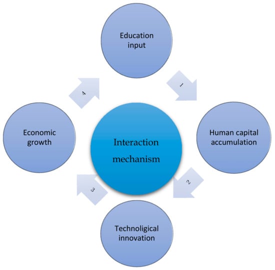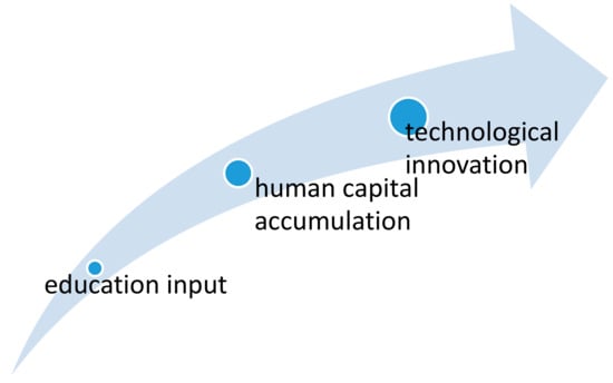 Technological innovation is the driving force of social and economic development, while education is an important way for knowledge precipitation and accumulation in technological innovation. The first step is to improve the quality of personnel through education input, gradually increasing the accumulation of human capital, and, thus, promoting technological innovation and progress (Figure 1).