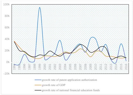 From the analysis of Figure 3, we can simply see that over the years from 1998 to 2008 the annual growth rate of the GDP, as measured by the current price, is rising, with some fluctuations. In the meantime, the national financial education fund growth rate also appears to be increasing, but there is a slight uplift in the fluctuation range of the growth rate of the patent application quantity. It is noteworthy that the annual growth rate of the GDP, the growth rate of the national financial education fund, and the growth rate of patent application authorizations have shown the same fluctuation trend, while in a downward trend since 2009.