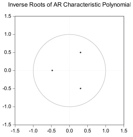 Since the VAR model establishes a dynamic system and does not make a strict distinction between the dependent variable and the independent variable, we do not focus on the significance of the unilateral process. However, the estimated results still show that the equations in the model have good significance (see Table 2). The results of the stationary test of the VAR model show that all the characteristic roots of the model are in the unit circle (Figure 4), so the model is a stationary VAR model. Combining the internal relationship of the economic system, the VAR model we selected is a model with a lag order of 1. Therefore, we can further analyze the relationship between variables based on the VAR model.