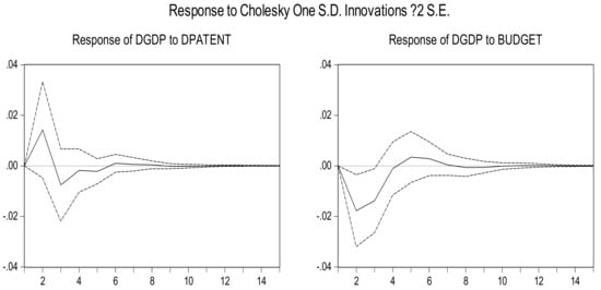 The results of the stationary test of the VAR model show that all characteristic roots of the model are in the unit circle (Figure 4). That is why it is a stationary VAR model, and, simultaneously, the Granger causality test verifies that the first-order difference of the annual growth rate of the patent application authorizations and the annual growth rate of the national fiscal education funds are the Granger reasons for the alteration of the annual growth rate of the GDP. Therefore, considering this, the paper proceeds with the implementation of the impulse response and variance decomposition in the effect of the first-order difference of the annual growth rate of patent applications and the annual growth rate of the national fiscal education funds.