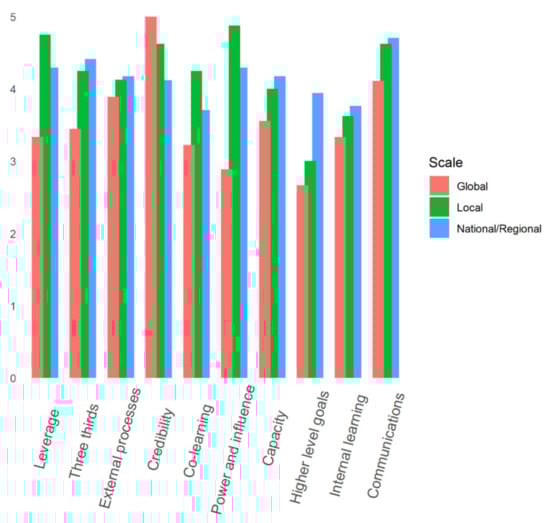 Across the ten principles which we assessed [52], building scientific credibility and strategic communication of research results stood out as having the highest importance on average (average of 4.5 on the 1–5 scale). Mainstreaming higher-level goals was ranked as having the lowest importance on average (average 3.3), with 32% of case studies reporting this as having little to no importance (score of 1 or 2). However, we found differences in the rankings across scales (Figure 1), for example at the local and national scale, the principle of understanding power differences was rated as significantly more important than in the case studies at the global scale (p < 0.001 and p < 0.01; Tukey’s Honest Significant Difference). Similarly, there were also scale differences as to how other principles were rated. For example, case studies at the global and local scale rated scientific credibility as significantly more important than those at the national/regional scales. Some of the principles were correlated—particularly navigating complexity and understanding power differences (r = 0.48), and co-learning and capacity building (r = 0.45)—showing these principles are explaining much of the same variance.