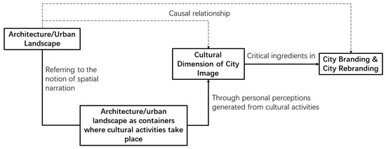 The theoretical framework concluding the literature review is shown in Figure 1, which illustrates the focus of this research: architecture/urban landscape is seen as containers where cultural activities take place, referring to the notion of spatial narration. Through personal perceptions generated from cultural activities, the cultural message can be delivered to cultural tourists, which further shapes the cultural dimensions of the city image. Since city image is a crucial ingredient in city branding and rebranding, architecture/urban landscape, involving cultural activities, are determinant in city branding and rebranding [55,62,63].