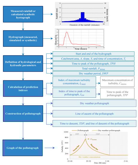 Based on time-continuous turbidity measurements in two urban sub-catchments, García et al. [26] proposed a stochastic methodology which allowed the prediction of the event maximum turbidity concentration (CMAXtb), the time to the peak of the pollutograph TPP, and the time to the descent of pollutograph TDP, from intermediate stochastic predictor indices. This procedure is summarized in Figure 1. In this work, the statistical prediction indices proposed by García et al. [26] are evaluated for different sub-catchments: Saint-Mihiel and Cordon-Bleu, from data collected in Hannouche [30]; Ensanche, from data of Del Río [6]. Moreover, three new rainfall events were considered in sub-catchments S1 and San Félix, besides the events from previous works [26]. A total of ninety three events were considered in present work, of which seventy four are new, and the others were considered from previous adjustments of the proposed stochastic model in García et al. [26].