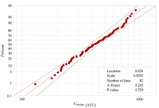 with R2 = 0.99. These three alternatives will be evaluated in the following sections. Equation (3) and (4) could be dimensionless dividing both sides of each equation by the 90th percentile of CMAXtb, calculated from the adjustment to a lognormal distribution of the 82 validated values of CMAXtb. This distribution was already proposed by Suarez and Puertas [25] and by Butler and Davies [31]. This dimensionless procedure does not change the values of CMAXtb obtained with previous Equations (3) and (4). The lognormal fit graphic of CMAXtb values have been included in the text through Figure 6. Lognormal parameters, such as location, scale, p-value for 0.05 significance, and the Anderson–Darling statistic are presented [32]. Figure 6 includes the fitted line and the 95% confidence intervals. In summary, the 90th percentile of CMAXtb could be used as the variable for dimensionless. Results of CMAXtb obtained through Equations (3) and (4) by proposed dimensionless would not change the previously obtained results.