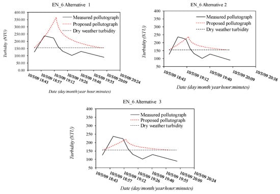 Comparison of the measured pollutograph with the three alternatives proposed, for the event of Ensanche 06 10/05/2009 [6].