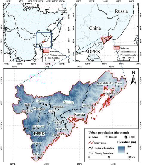 The transnational urban agglomeration of the Tumen River (TUATR) in northeastern Asia is located across the region of China, Democratic People’s Republic of Korea (DPRK) and Russia, with this geographical area including the major port cities of Vladivostok, Luojin, and Chongjin [,] (Figure 1). This region represents an important part of the “Chinese-Russian-DPRK-Mongolia” international channel as a key component of the Chinese “The Belt and Road” strategy [], which has also been identified as a key region for the development of Russia’s Far East region and Luoxian Economic Zone in DPRK. Therefore, the sustainable development of regional cities in this area is of great importance to three countries [,,]. The rapid urbanization of this region has resulted in an increase in the UHII in this area [], with global warming predicted to increase the temperature of this region further [,]. Therefore, quantifying the spatial pattern of UHII across the TUATR is important to promote the sustainable development of regional cities in this area.