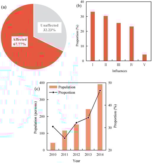 Influences of urban heat island effects on residents in Yanji City: (a) proportion of affected respondents; (b) proportion of respondents with different influences *; (c) population and proportion of deaths due to diseases related to high temperature in summer **. Note: Only the influences in Yanji City were analyzed due to availability of data. * I: physical discomfort, II: insomnia, inappetence or heat stroke, III: respiratory diseases, IV: decreasing outdoor activities, V: other influences. ** The diseases related to high temperature in summer mainly include hypertension, cardiopathy, and asthma.