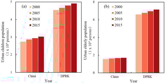 Changes in the total population of children and elderly people from 2000 to 2015 in the region of China and DPRK of the TUATR: (a) changes in population of children; (b) changes in population of the elderly. Note: Due to the limited availability of data, only population distributions for children and elderly people in the region of China and DPRK were analyzed.