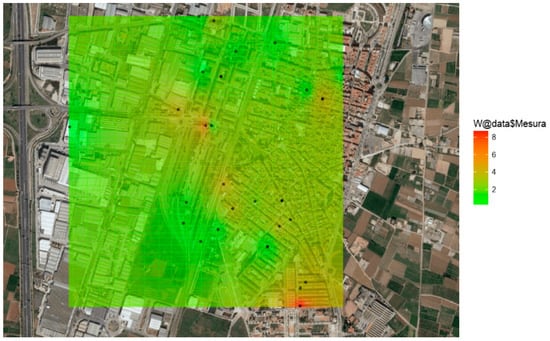 Map of the city of Silla, with the location of the TSs. The color shows the average MF values interpolated with the geostatistical methodology used by our team in the analysis of noise levels [22,23].