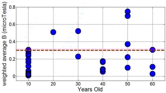 From the measures in Table 1, a weighted exposure level is calculated that takes into account the possible permanence of residents in each part of the dwelling and bedroom. The average level of exposure in the rooms and in the bed is taken into account, assuming that the resident spends 12 h in his or her home and of these, 8 h rests in the bedroom. The averaged measurement in the rooms is multiplied by 1/3 and the measure in the bed is multiplied by 2/3, the sum of both amounts gives us the weighted average in each dwelling. The weighted average is shown in Figure 4, with a red line showing the limit level of 0.3 μT.