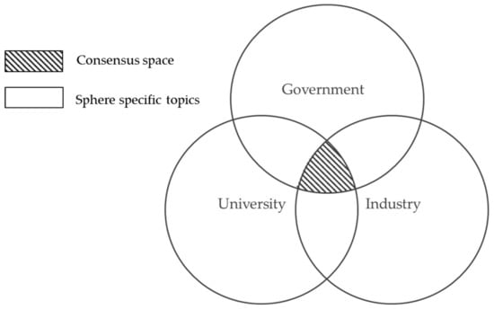 As indicated above, our primary focus will be on what we call institutionalized ideas and their distribution across specialist spheres that together form the three corners of the Triple Helix innovation system [21,23]. This general model is typically used as an analytic tool in studying science and innovation policies or transfer of ideas from different knowledge producers to policy-making [24,25,26]. In the original model, it was assumed that an effective innovation policy requires a “hybridization” or building of institutional overlap between the three main spheres instead of a system being dominated by one sphere or having an anarchic system without coordination between the spheres. A more developed version of the model [7] emphasises role differentiation between industries, governments and universities, with each sphere having a special role in contributing to new innovations. For this to take place successfully a “consensus space” is needed where the actors in the three spheres can come together in the spirit of mutual understanding and trust (see Figure 1). Mechanisms such as technology transfer, collaboration and conflict moderation, leadership, and networking in the consensus space are considered to contribute to systemic innovations [7].