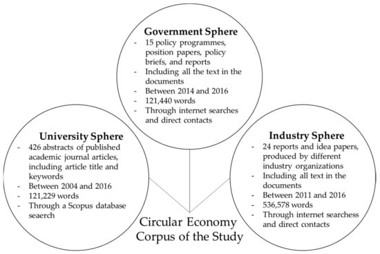 Our research applied topic modelling, which is a recent and increasingly common approach to computational text analysis method suitable for large corpora of text documents [22,44,45]. The aim of topic modelling is to discover latent topics and their combinations in texts [22,44,45]. As a method, it belongs to the broader field of probabilistic modelling [44], and suits explorative and theory constructing research [46]. In the context of social sciences, it has been used, for example, to analyse political frames held by decision-makers and media organisations [46,47], and for discovering similarities and differences of political logics in social movements [45]. Here, it was applied to identify shared and specific topics in a large corpus of texts concerning circular economy in the context of the Triple Helix spheres of industry, government and university. The following section presents the data, i.e., the text corpus, used in the modelling, and is followed by a more detailed description of the methodology of topic modelling.