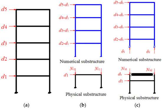 The compatibility and equilibrium conditions should be satisfied at the boundary between the physical and the numerical substructures during the HS. Consider the five-story example shown in Figure 1. Figure 1a shows the full model of the structure. Figure 1b illustrates the traditional boundary between two substructures, which is located at the top of the first story. This traditional boundary strategy mainly takes the structure model as an idealized shear model. The equilibrium of shear forces and the compatibility of the horizontal or shear displacement is satisfied by the hydraulic actuator. The equilibrium of the bending moment and axial force, as well as the compatibility axial and rotational deformations are typically neglected. Consequently, only two kinds of loading device are required at the boundary between the numerical substructure and the physical substructure: (i) one is the horizontal loading device to impose the shear force or displacement; and (ii) the other is the vertical loading device to simulate the gravity load due to upper stories, which is usually taken to be constant during the test. Therefore, several inevitable errors are introduced by not satisfying compatibility and equilibrium conditions.