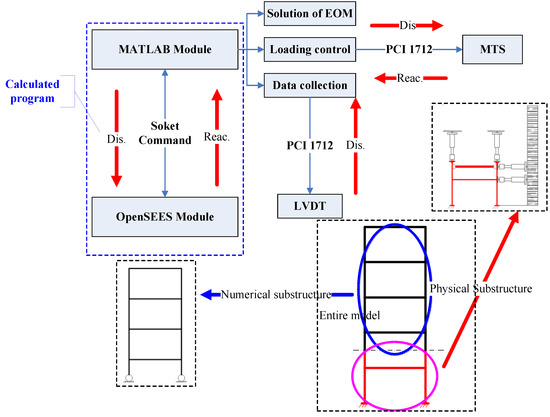 - Step 4: The calculated displacement command of the numerical substructure and the prediction axial deformation at the boundary are sent to the numerical substructure. Subsequently, the reaction force at the boundary is calculated. Similarly, the data calculated by OpenSEES are sent to the Matlab program and subsequently wait to receive the data calculated by Matlab for the next step.