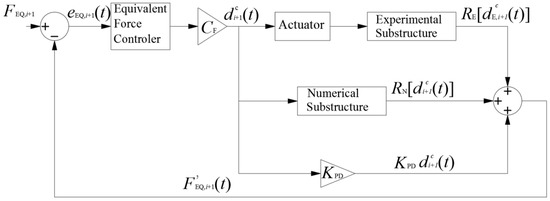 This proposed approach combines the EFC method with the proposed inflection point boundary condition technique to conduct HS tests. The EFC method is based on the feedback control method shown in Figure 4. Here, the FEQ,i+1, which is used for the equivalent force (EF) command, can be calculated by the information before the i + 1 step. Therefore, the FEQ,i+1 is available and remains unchanged at i + 1 step. The FEQ,i+1, which is used for equivalent force (EF) feedback, is obtained by the three terms: (i) the reaction of the experimental substructure , which is measured by the load cells; (ii) the reaction of the numerical substructure , which is obtained from the results of the numerical simulation; and (iii) the pseudo-dynamic force, which is linearly related to displacement by KPD. The displacement command, , is determined from the force signal using the force-displacement conversion matrix CF. The equivalent force controller is used to make certain that the EF feedback can track the EF command quickly without overshoot. This paper uses a PD controller as the equivalent force controller. The parameters of the PD controller are obtained as discussed in Reference [39].