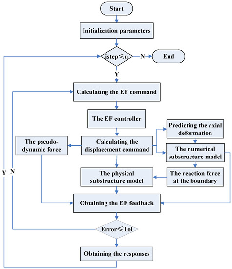 - Step 6: The EF feedback is obtained by summing up the pseudo-dynamic force, and the reaction of both the numerical substructure and the physical substructure. Then, compare the EF feedback with the EF command to obtain the error between them. If the error between the EF feedback with the EF command is less than the specified tolerance, go the next step. If not, repeat the steps from the third step to the sixth step.