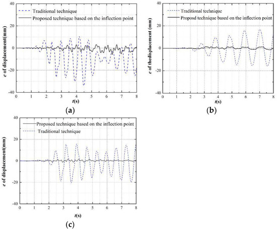 The time history of the displacement errors for the different boundary techniques at the first story: (a) Test 2; (b) Test 8; and (c) Test 13.
