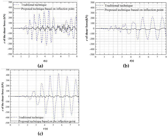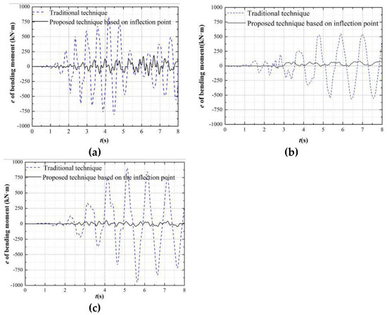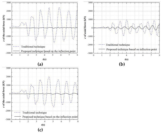 Figure 7, Figure 8 and Figure 9 show the error time history of the bending moment, shear force, and axial force, respectively, at the top of the column of the 1st story for the different boundary techniques. Here, the internal force (including bending moment, shear force, and axial force) errors have a similar tendency with the displacement errors in Section 4.2.1. The internal force errors of the proposed boundary technique based on the inflection point are the smaller than the traditional one.