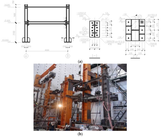 The physical substructure test model of the steel frame structure: (a) the design drawing of the physical substructure test model; and (b) the manufactured test model at the lab.