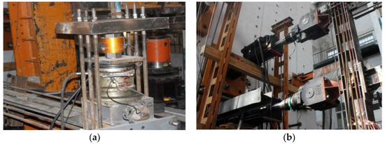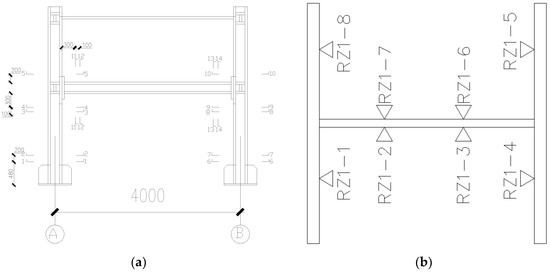 To realize the displacement–force mixed control, the arrangement of the vertical and horizontal loading devices was designed as shown in Figure 12. Two hydraulic jacks were chosen as the vertical loading devices while two hydraulic servo actuators as the horizontal loading devices.