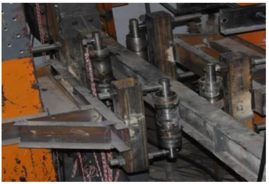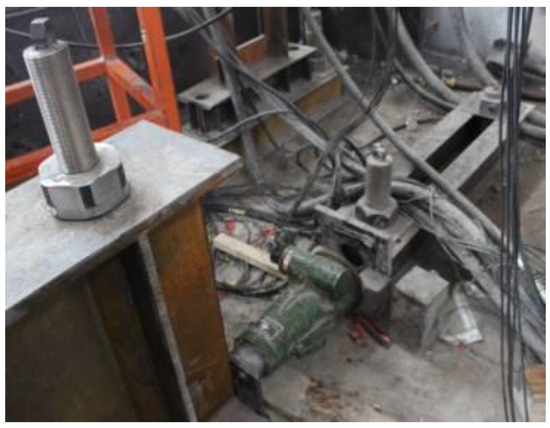 Figure 13b shows the horizontal loading devices which are two hydraulic servo actuators. One end of the hydraulic servo actuators is fixed into the actuator wall by four 100 mm-diameter bolt bars. The other end of the hydraulic servo actuators connects with the physical substructure model, in which one is located at the beam–column joint of the first story while the other at the boundary of the physical substructure model. The force capacity of two hydraulic servo actuators is ±1000 kN, and the displacement capacity is ±100 mm. The errors of both force and displacement are the 0.1% of the corresponding capacity. To avoid the horizontal slip of the physical substructure model, two measures were designed: one is that the mudsill of the physical substructure model is fixed on the floor of the lab by using 100 mm-diameter bolts spaced on 1 m centers; and the other is that two hydraulic jacks are used on both sides of the mudsill to apply the equal and opposite forces (Figure 14). In addition, four steel rollers were used on the side of both the first beam and the truss at the boundary, to avoid the out-of-plane deformation of the steel frame (Figure 15).