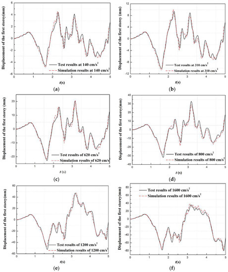 The comparison curves of the displacement time history between the test results and the simulation results with various PGA: (a) 140 cm/s2 of the PGA; (b) 310 cm/s2 of the PGA; (c) 620 cm/s2 of the PGA; (d) 800 cm/s2 of the PGA; (e) 1200 cm/s2 of the PGA; and (f) 1600 cm/s2 of the PGA.