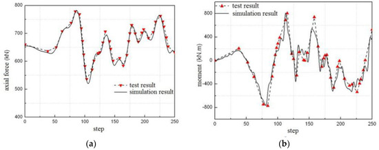 The comparison curves of the internal force time history between the test results and the simulation results at the 620 cm/s2 of PGA: (a) axial force at the bottom of column; and (b) bending moment at the bottom of column.