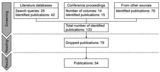 Number of search queries, volumes, identified and dropped publications in the screening phase (title and abstract), the reading phase (full text) and the final result.