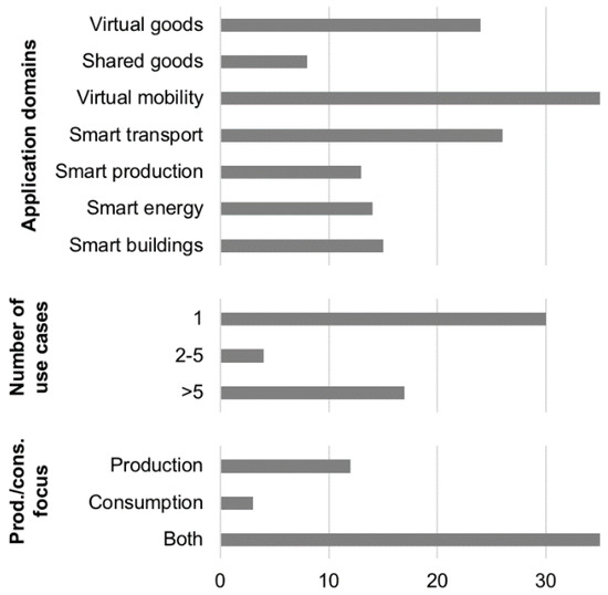 In the following, we present the results of our literature review, specifically (i) what application domains have been covered, (ii) the number of use cases focused on, (iii) whether the studies focused on ICT-induced patterns of production or consumption, and (iv) the methodological approaches applied.