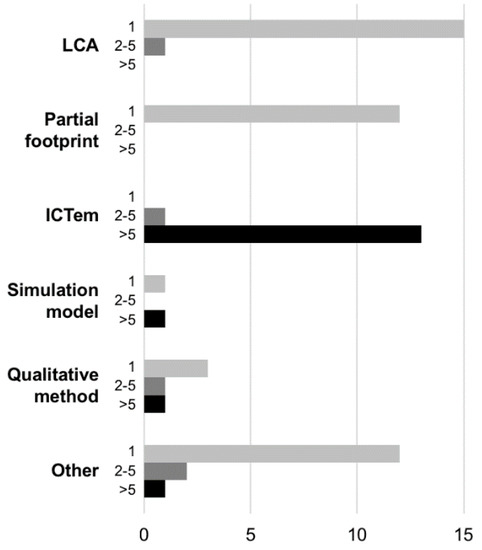 Researchers use a variety of approaches for the assessment of indirect environmental effects of ICT. The assessments identified in our literature review used 15 approaches, namely agent-based modeling (ABM), system dynamics (SD), life cycle assessment (LCA), partial footprint, the “ICT enablement method” (ICTem), regression analysis, descriptive statistics, material input per service unit (MIPS), transport models, vehicle drivetrain models, scenario analysis, literature review, meta-analysis, interviews, and surveys. LCA, ICTem, and partial footprint are by far the most frequently used assessment approaches, whereas simulation methods and qualitative approaches are less often applied. In the following we describe the approaches and how they are applied in the field of indirect environmental effects of ICT. We exclude descriptive statistics, interviews, surveys, vehicle drivetrain models, literature review, and meta-analysis, as these are too generic. We further add the Software Sustainability Assessment method (SoSa), a recent approach proposed in the ICT4S community to assess the environmental impact of software systems [80,81]. Figure 3 subsumes meta-analysis, scenarios, transport models, vehicle drivetrain models, regression analysis, descriptive statistics, surveys, and MIPS under “others”. “Qualitative methods” include interviews and literature reviews.