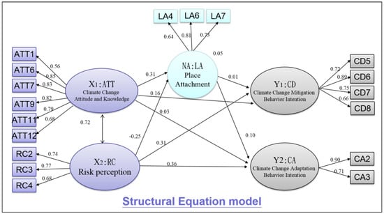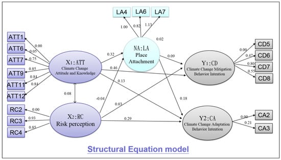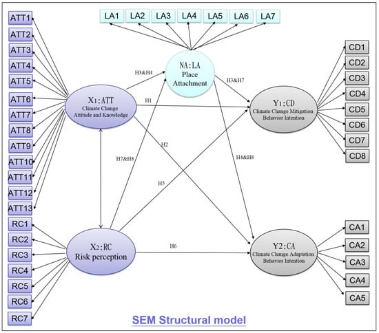 Based on literature reviews, hypotheses about SEM paths are presented. As shown in Table 1, the hypotheses concerning SEM are based on factor analysis and seek to verify the measurement model of measurement variables in each dimension. Path analysis was performed to verify the structure model of each dimension to test whether each path is supported by the hypotheses. Path analysis was carried out to compare the paths of SEMs in areas of different sensitivities to elucidate the relationships among climate change attitudes and knowledge, risk perceptions, place attachment, mitigation, and adaptation behavior.