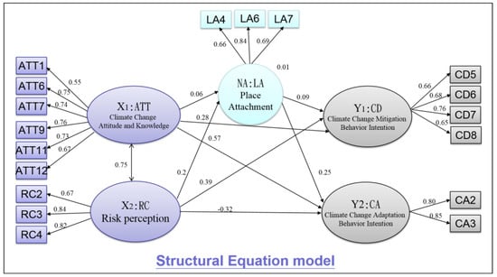 As can be seen in Figure 2, the five circles represent the core concept of this study, including climate change attitudes and knowledge, risk perceptions, place attachment, mitigation, and adaptation behavioral intentions. The square represents the specific measurement that is used to explain the concept, and is also the topic of the research questionnaire. Arrows point to causal relationships, and numbers represent positive or negative coefficients and the size of coefficients. For example, H1 represents “climate change attitudes and knowledge directly affects climate change mitigation behavioral intention”. H3 stands for “climate change attitudes and knowledge through intermediate factors (place attachment) indirectly affects climate change mitigation behavioral intention”.
