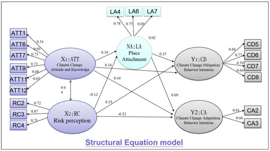 “Disaster risk perceptions” directly affects “climate change-related adaptation behavioral intention”, with an impact coefficient of 0.03. “Disaster risk perceptions” directly affects “climate change-related adaptation behavioral intention”, with an impact coefficient of 0.29. “Disaster risk perceptions” negatively affects “place attachment”, with an impact coefficient of −0.4. Through “place attachment”, “perceived risk of disaster” indirectly affects “climate change-mitigation behavioral intention”, with an impact coefficient of −0.00 (−0.04 × 0.09 = −0.0036). Through “place attachment”, “perceived risk of disaster” indirectly affects “climate change-related adaptation behavioral intention”, with an impact coefficient of −0.01 (−0.04 × 0.18 = −0.0072).