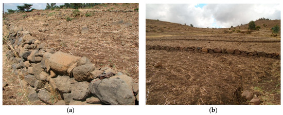 The concept of SLM has emerged as an important global issue due to accelerating land degradation worldwide, including Ethiopia. SLM refers to the use of suitable technologies or practices that farmers implement on their farmland to satisfy individual and community needs, while simultaneously ensuring the long-term productive potential of the farmland and maintaining environmental functions [22,23,24]. SLM practices are structural, agronomic, vegetative and management measures used to control soil erosion, reduce nutrient depletion, improve soil conservation and enhance productivity [17,25]. Some examples of SLM practices include: terraces, stone/soil bunds, minimum tillage, intercropping, composting, manuring and agroforestry. This study focuses on stone bunds, which, in Ethiopia, can play a crucial role in addressing soil erosion on farmlands [26,27]. Stone bunds are an embankment of stones constructed along the contour line to reduce or stop the velocity of water flowing down-slope, consequently reducing soil erosion [26,27] (Figure 1).