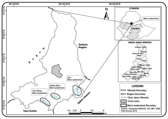 Map of Ethiopia, the Girar Jarso woreda and the three studied watersheds.