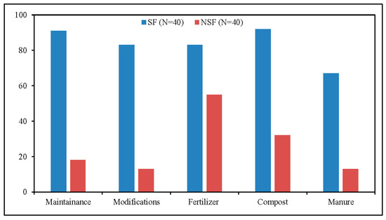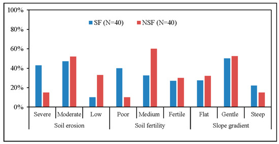 Figure 3 presents some clear perceived differences between SFs and NSFs. Firstly, the findings revealed that 90% of SFs implement stone bunds on farmlands at perceived moderate to severe erosion levels, compared to 67% of NSFs. In addition, 40% of SFs and only 10% of NSFs implement stone bunds on farmland with perceived poor soil fertility. Hence, a large majority (90%) of NSFs and 60% of SFs implement stone bunds on their most fertile farmlands, respectively. Furthermore, more SFs (23%) implement stone bunds on steeper farmlands, as compared to NSFs (15%). A large majority of farmers (77% of SFs and 85% of NSFs) implement stone bunds on slope gradients that are perceived as flat to moderate. Moreover, the mean farm plots sizes, where the stone bunds are implemented, are 0.58 hectare for SFs and 0.65 hectare for NSFs, respectively. Concerning locations of farmlands where stone bunds are implemented, the mean walking distances from home are about 13 min for SFs and about 32 min for NSFs, respectively.