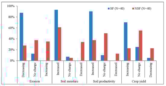 Perceived effects of stone bunds on the farmland in Girar Jarso woreda, Central Ethiopian Highlands. Key: SF—spontaneous adopting farmer, NSF—non-spontaneous adopting farmer.